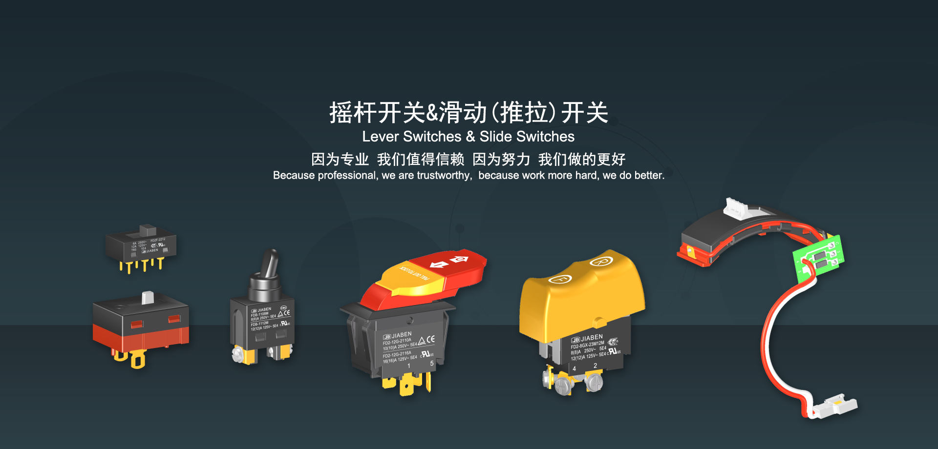 浙江佳奔電子有限公司始建于1986年,坐落于浙江省樂清市虹橋鎮(zhèn)東電子信息產(chǎn)業(yè)園內(nèi),現(xiàn)有職工700多人,資產(chǎn)總額超3億元。公司主要經(jīng)營“JIABEN”牌微動開關(guān)、蹺板開關(guān)、按鈕開關(guān)、扳機開關(guān)、調(diào)速開關(guān)和電位器開關(guān)等各類交、直流器具開關(guān)和各類交、直流線路板模塊等產(chǎn)品,主要應(yīng)用于交、直流電動工具、電動園林工具、清潔器具、家用電器和小型機床等行業(yè),是集產(chǎn)品設(shè)計、研發(fā)、制造、銷售和服務(wù)于一體的國家高新技術(shù)企業(yè)。JIABEN was founded in 1986, located in East Electronic Information Industry Park, Hongqiao Town, Yueqing City, Zhejiang Proviance, existing staff more than 700 peoples, more than 300 million RMB worth of assets. Company is mainly engaged in "JIABEN" brand Micro Switch, Rocker Switch, Push-button Switch, Trigger Switch, Speed Regulating Switch, Potentiometer Switch and other kinds of appliance switch and all kinds of AC or DC circuit board module, such as more than 100 series, 8000 kinds of models of products, mainly used in AC or DC Power-tools, Power Gardening Tools, Cleaning Appliances, Household Appliances and Small Machine Tool and other industries, is the collection product design, research and development, manufacturing, sales and service in one of the national high and new technology enterprise.
